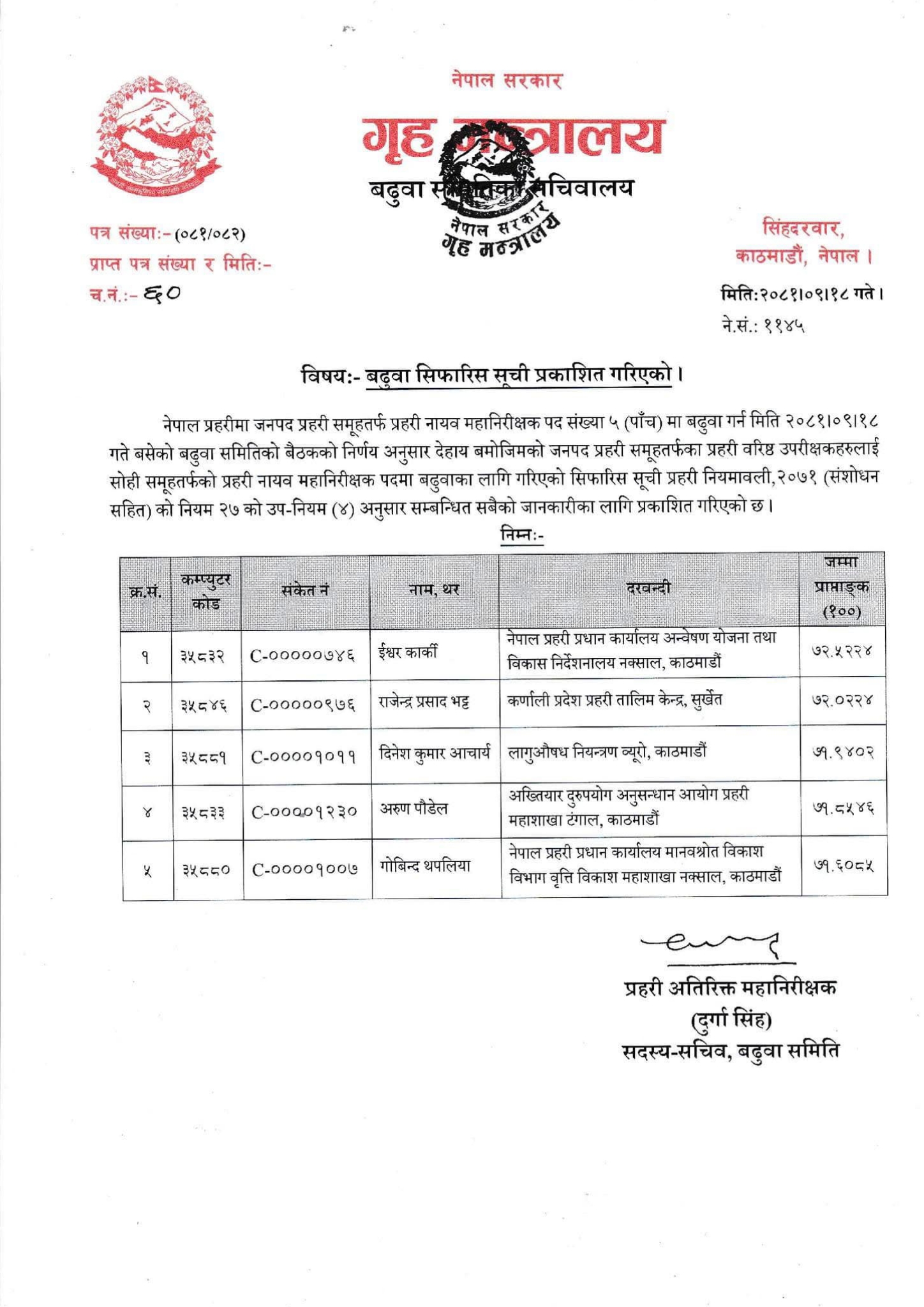 उनीहरुलाई आज डीआईजीमा बढुवा गर्न सिफारिस गरिएको प्रहरी प्रधान कार्यालय नकसालले जानकारी दिएको छ ।