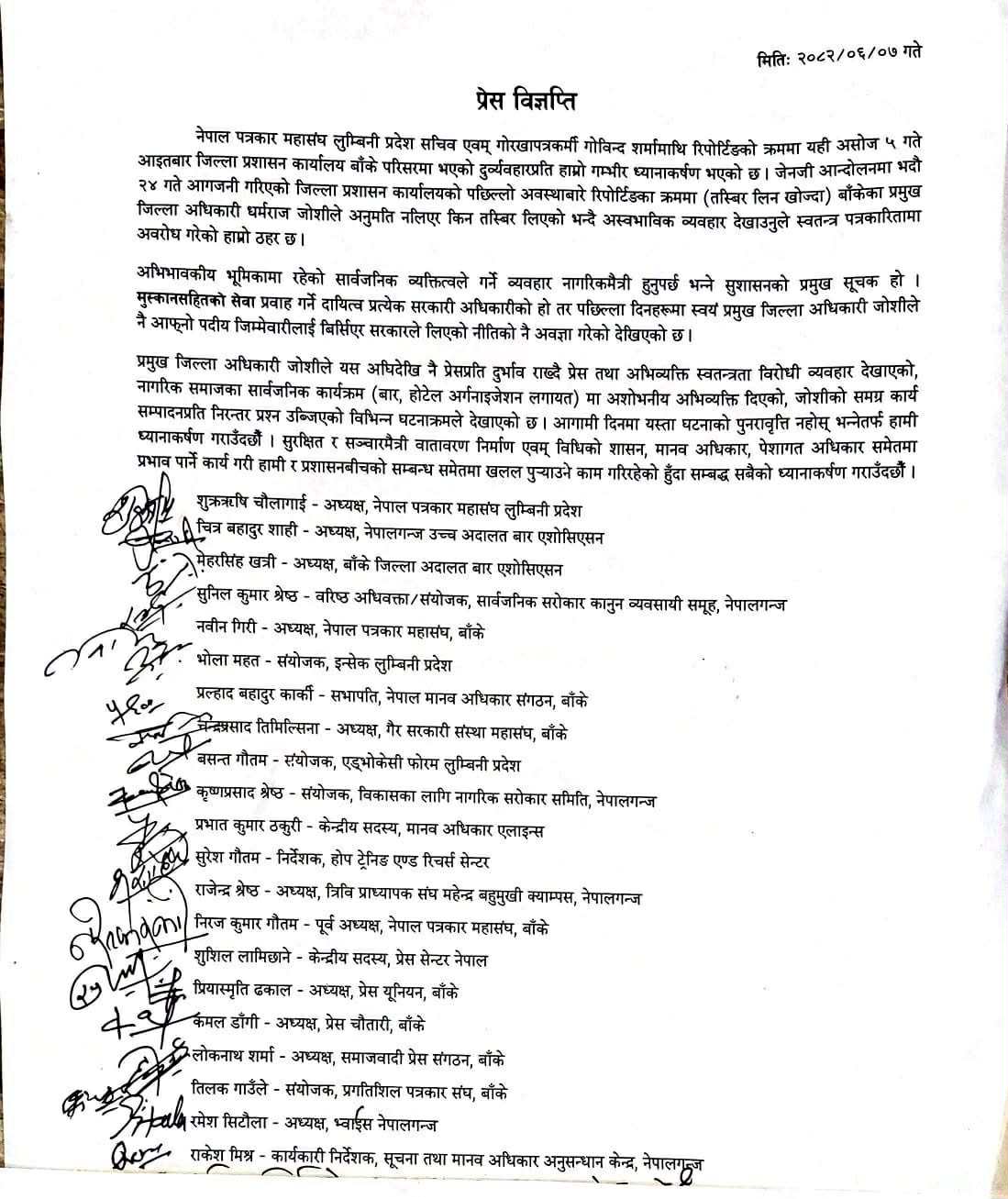 नेपाल पत्रकार महासंघ लुम्बिनी प्रदेशका अध्यक्ष शुक्रऋषि चौलागाई, नेपालगञ्ज उच्च अदालत बार एशोसिएसनका अध्यक्ष चित्र बहादुर शाही, बाँके जिल्ला अदालत बार एशोसिएसनका अध्यक्ष मेहरसिंह खत्री, वरिष्ठ अधिवक्ता सुनिल कुमार श्रेष्ठ, नेपाल पत्रकार महासंघ बाँकेका अध्यक्ष नवीन गिरी, इन्सेक लुम्बिनी प्रदेशका संयोजक भोला महतले विज्ञप्तिमा हस्ताक्षर गरेका छन् ।