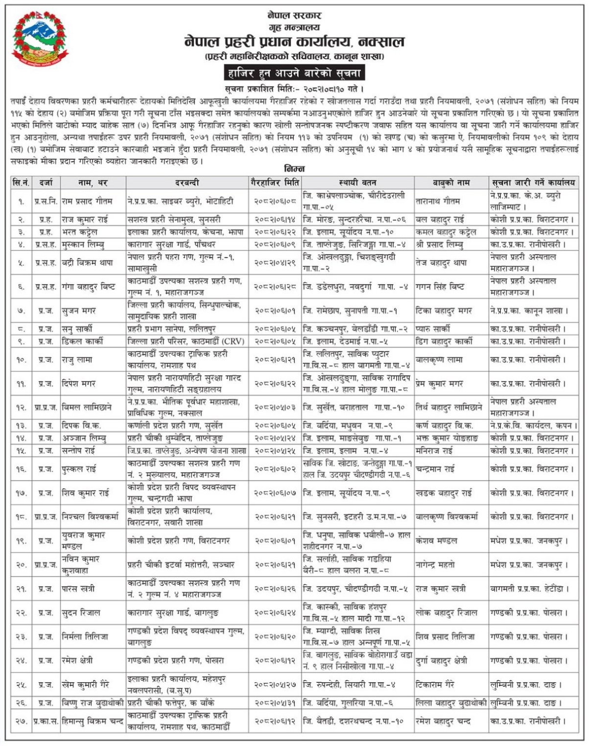 काठमाडौं । प्रहरी प्रधान कार्यालयले गैरहाजिर रहेका २७ जना प्रहरी कर्मचारीलाई सात दिनभित्र हाजिर हुन निर्देशन जारी गरेको छ।