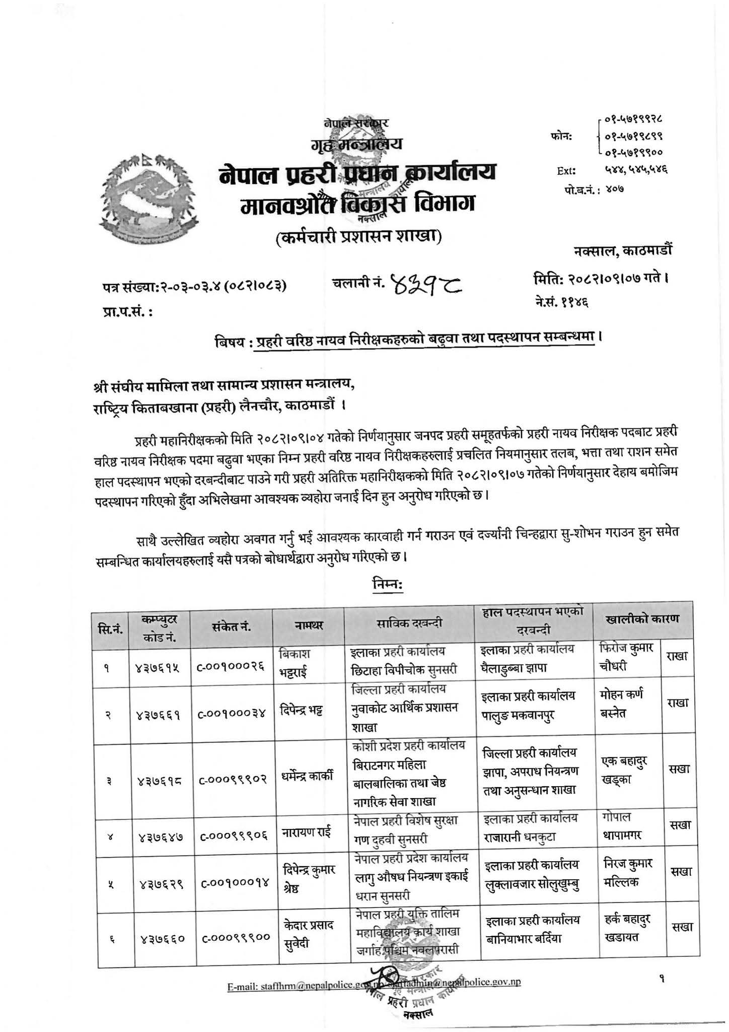 नेपाल प्रहरीका २९३ वरिष्ठ सईको सरुवा (सरुवा सूचीसहित)