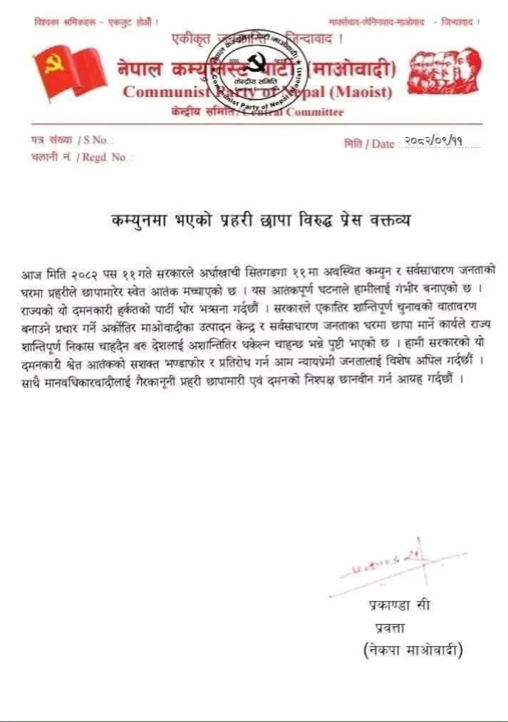 उनले भनेका छन् ‘ सरकारले एकातिर शान्तिपूर्ण चुनावको वातावरण बनाउने प्रचार गर्ने अर्कौतिर माओबादीका उत्पादन केन्द्र र सर्वसाधारण जनताको घरमा छापा मार्ने कार्यले राज्य शान्तिपूर्ण निकास चाहादैन बरु देशलाई अशान्तितिर धकेल्न चाहान्छ भन्ने पुष्टी भएको छ ।’