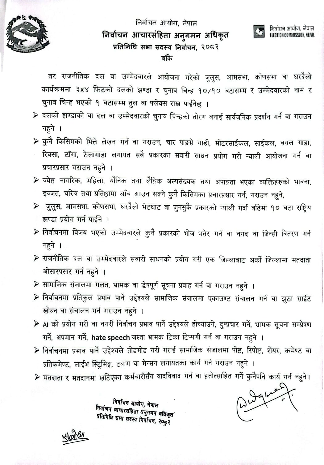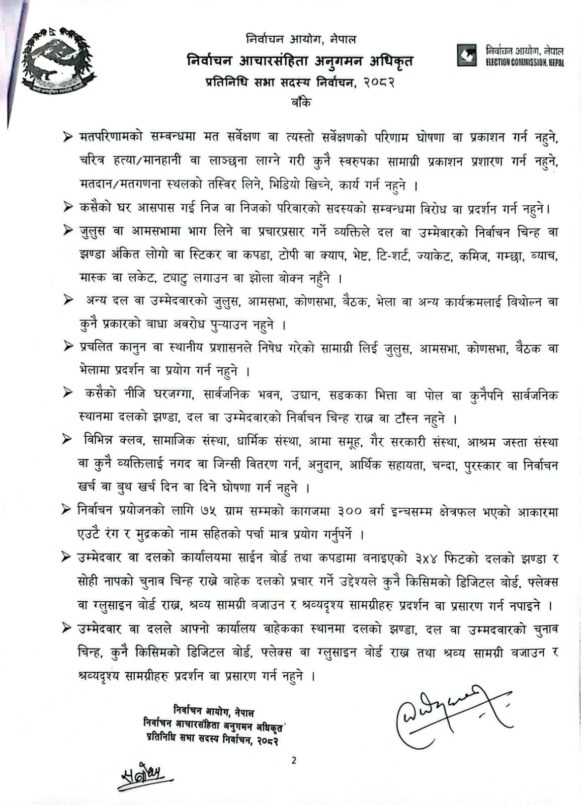 > मतपरिणामको सम्वन्धमा मत सर्वेक्षण वा त्यस्तो सर्वेक्षणको परिणाम घोषणा वा प्रकाशन गर्न नहुने, चरित्र हत्या/मानहानी वा लाञ्छना लाग्ने गरी कुनै स्वरुपका सामाग्री प्रकाशन प्रशारण गर्न नहुने, मतदान/मतगणना स्थलको तस्विर लिने, भिडियो खिच्ने, कार्य गर्न नहुने ।