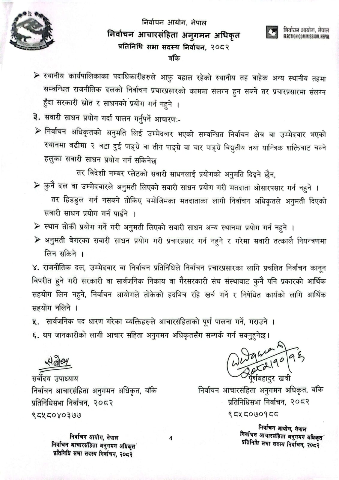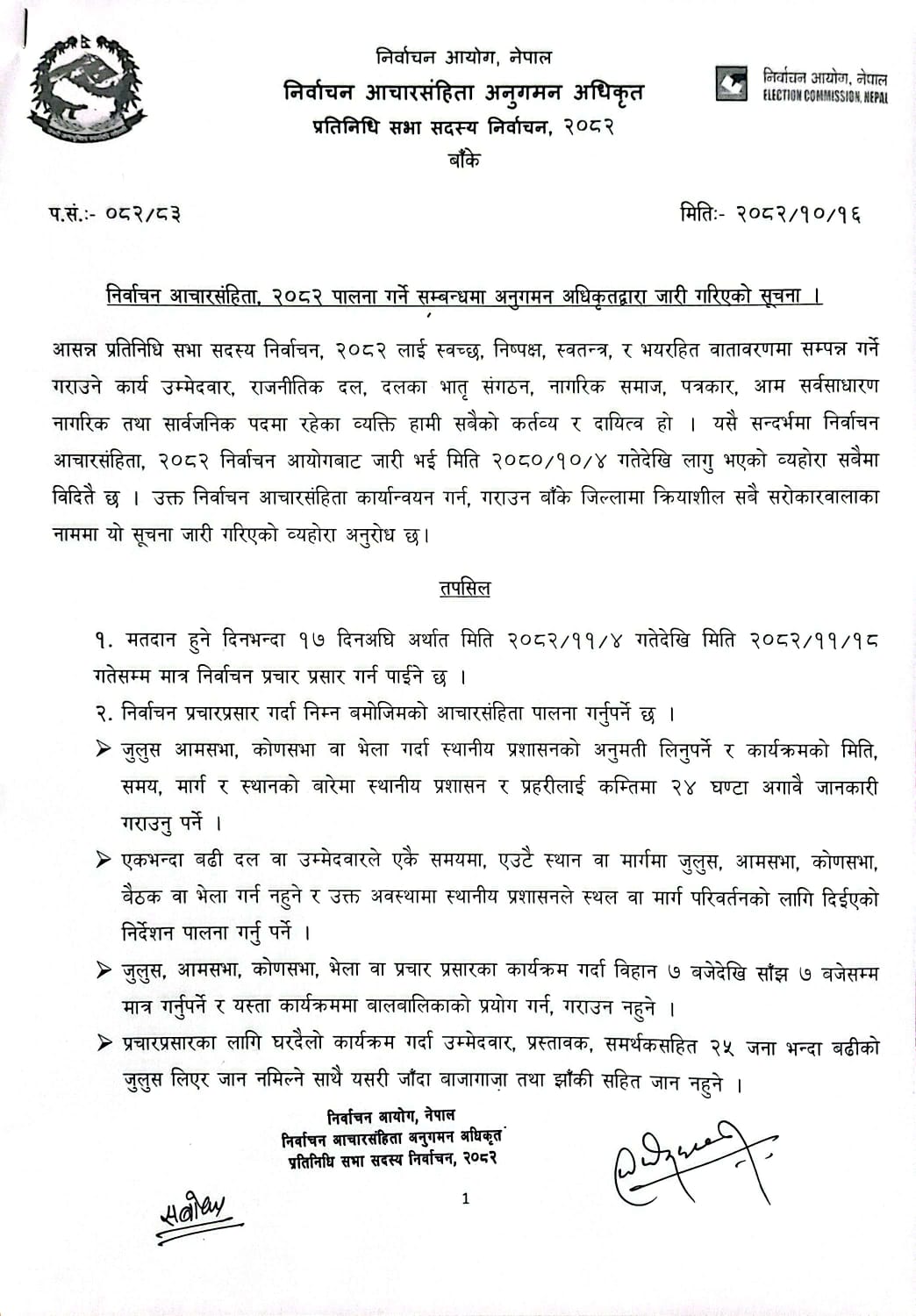 आचारसंहिता कार्यान्वयनका लागि निर्वाचन आयोगको तर्फबाट खटिएका आचारसंहिता अनुगमन अधिकृत पुर्ण बहादुर खत्री र सर्वोदय उपाध्यायले विज्ञप्तिमार्फत बाँकेका सम्बन्धित सबै निकाय, राजनीतिक दल, उम्मेदवार, सञ्चारमाध्यम र आम नागरिकलाई सचेत गराएका छन्।