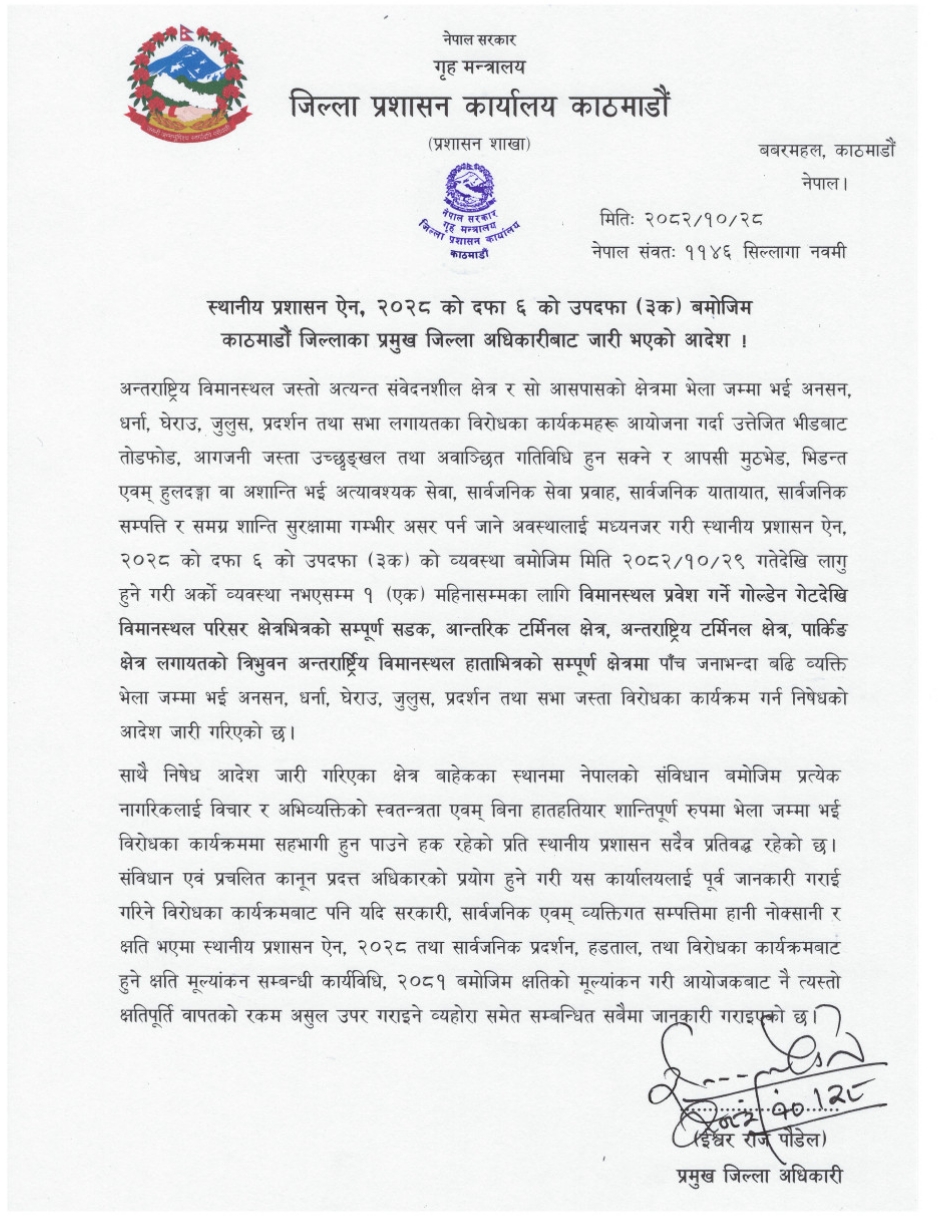 - विमानस्थल आसपासका क्षेत्रमा १ महिनासम्म निषेधाज्ञा जारी