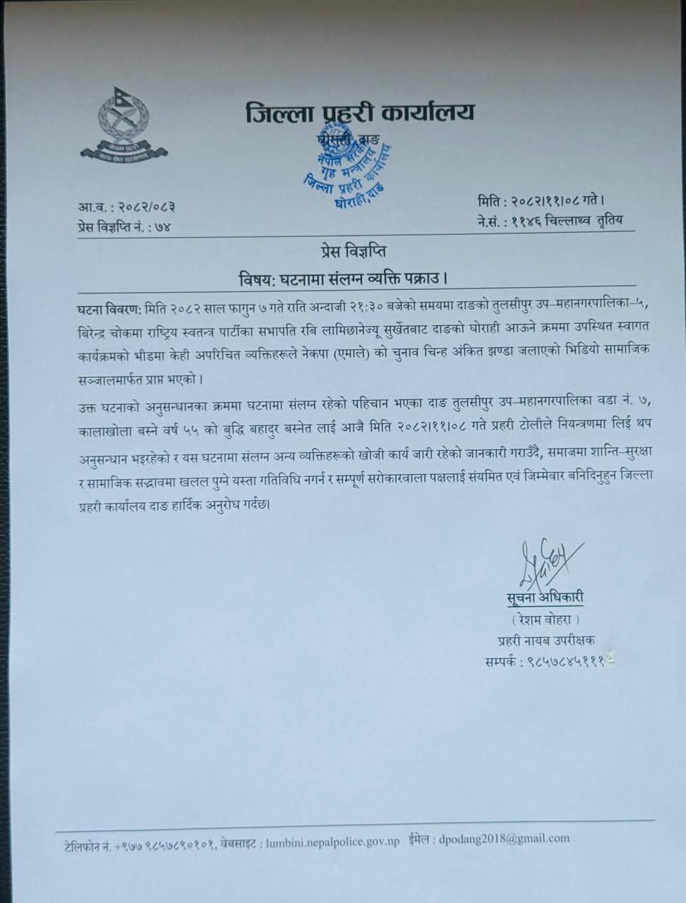 - दाङमा एमालेको झण्डा जलाएको आरोपमा ५५ वर्षीय बुद्धिबहादुर पक्राउ
