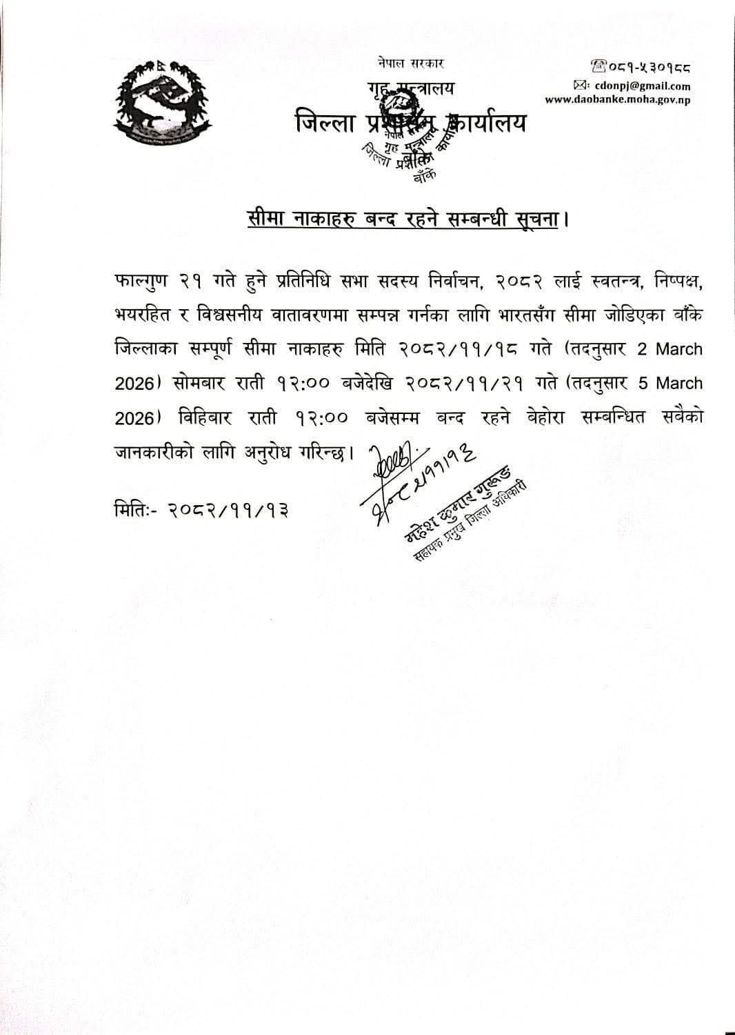 फागुन २१ को निर्वाचनको ७२ घण्टाअघिनै सीमा बन्द गर्ने निर्णय