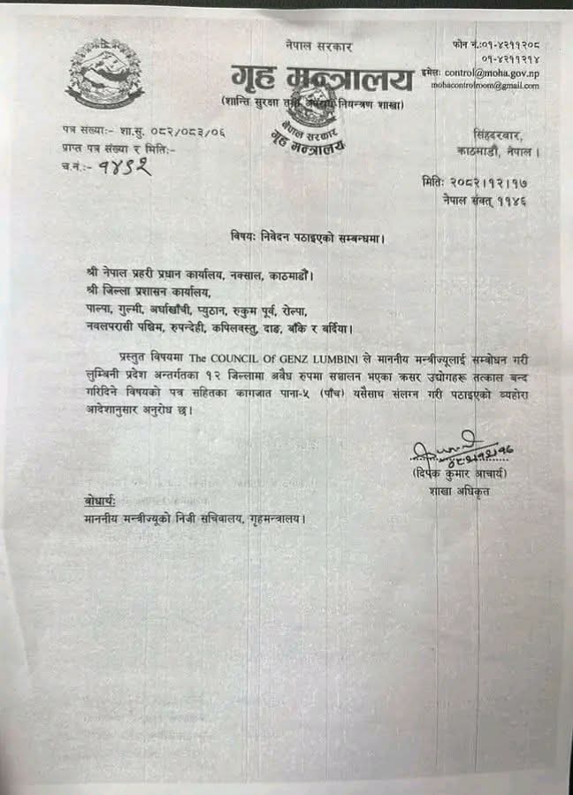 - लुम्बिनी प्रदेशका अवैध क्रसर बन्द गराउन गृह मन्त्रालयको निर्देशन