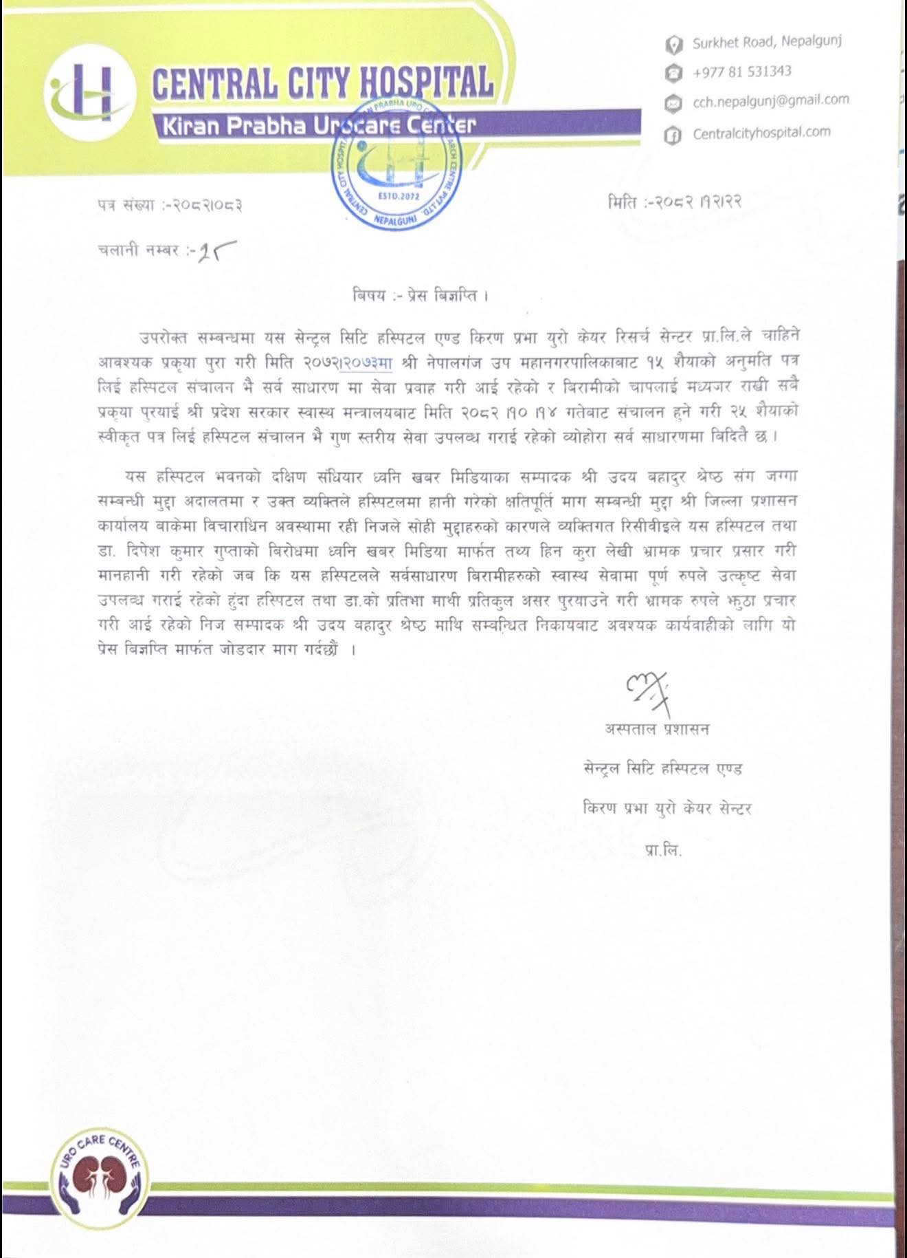 - सेन्ट्रल सिटी हस्पिटलले भन्यो-'भ्रामक प्रचारविरुद्ध आपत्ति छ', कारबाहीको माग (विज्ञप्तिसहित)