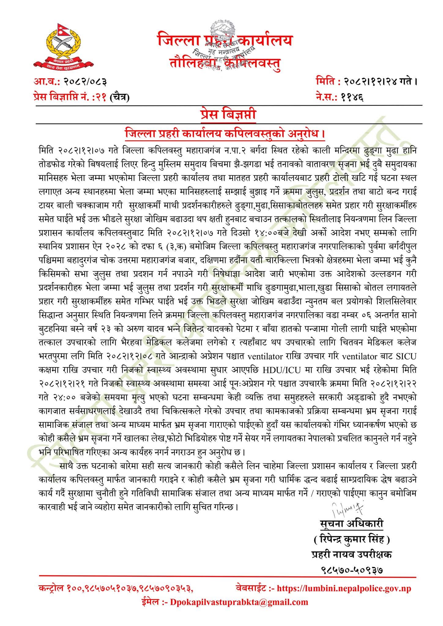 - कपिलवस्तुमा घाइते युवकको मृत्यु प्रकरण: भ्रामक सूचना फैलाउनेमाथि कारबाहीको चेतावनी