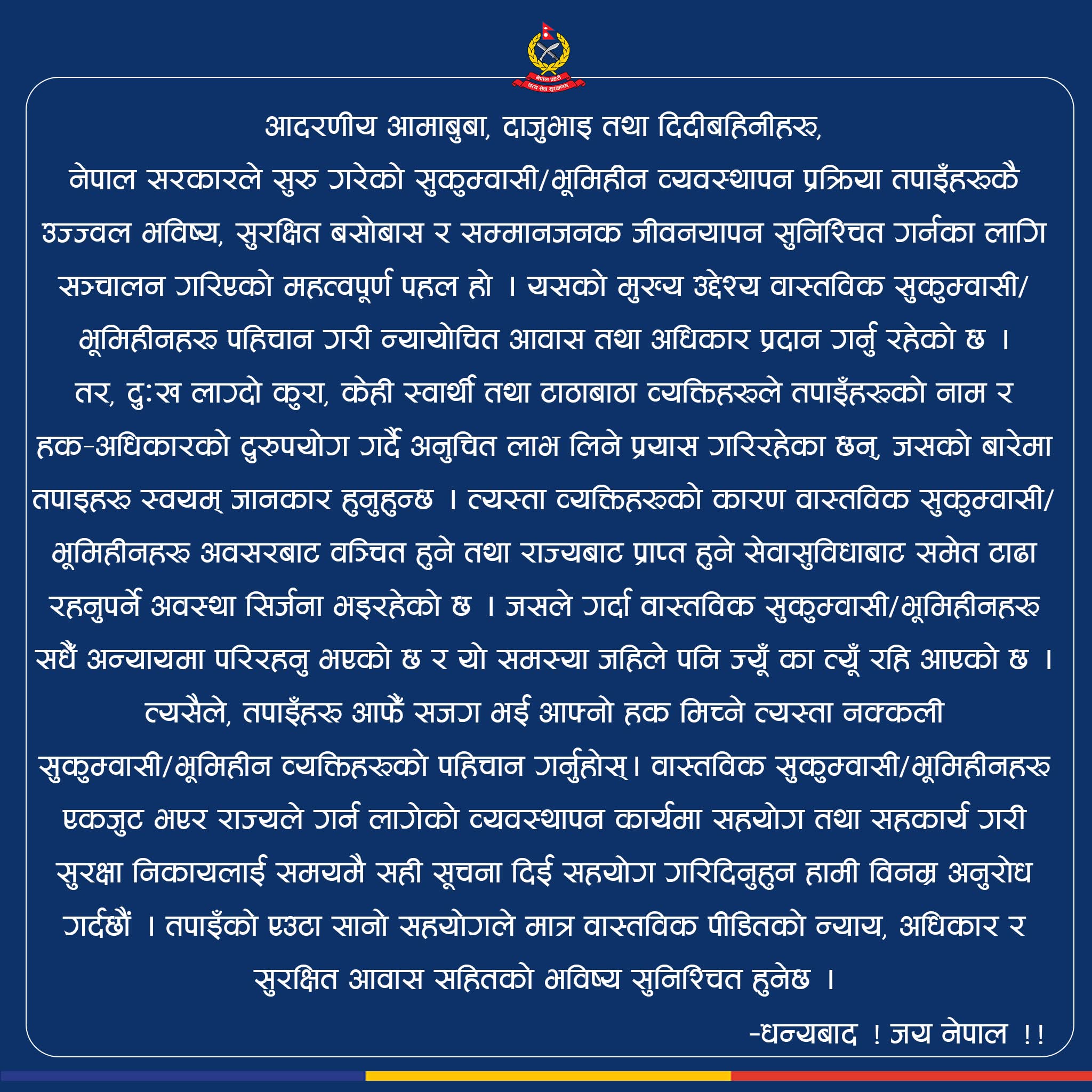 - सुकुम्बासीका नाममा हुने ठगी रोक्न नागरिक सूचना दिन प्रहरीको आग्रह