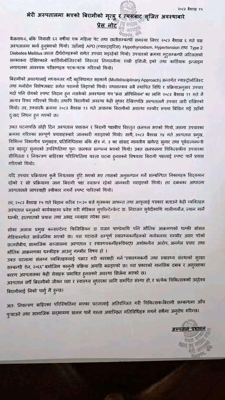 - बिरामीको मृत्युपछि भेरी अस्पतालमा तनाव, मेसुमाथि आक्रमणको प्रयास,'के भन्छ अस्पताल?'